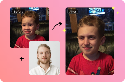 Faces on friend photos, family photos, wedding photos, and graduation photos can be changed instantly